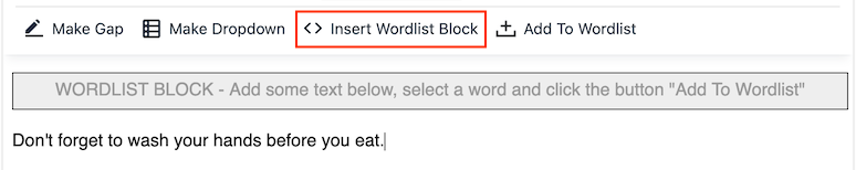 1. First, click inside the text area and click on the button "Insert Wordlist Block" in the toolbar above. Below the "Wordlist block" area that now got created, you can add some text.