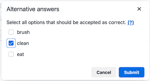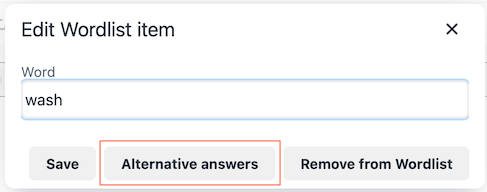 Select a word that you've turned into a "gap," and you'll see an option to add alternative correct answers. In this example, we clicked on "wash":
