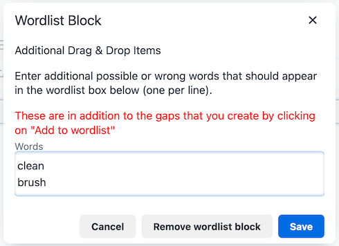 Previously, our wordlist blocks only contained the specific words needed to fill the gaps. While effective, this sometimes made it too easy for students to solve the puzzle through simple elimination.