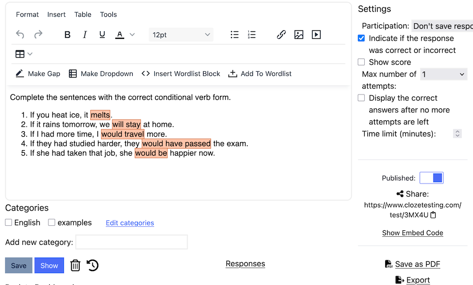 - In our editor, you can change the default settings and make adjustments to the generated exercise if you wish to: