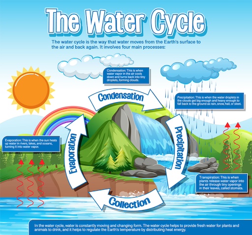 The water cycle is a continuous process that moves water around our planet. It begins with , where the sun heats up water in rivers, lakes, and oceans, turning it into . This gas rises into the atmosphere.